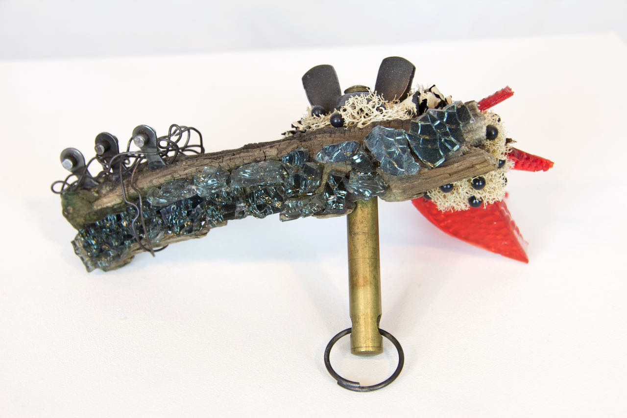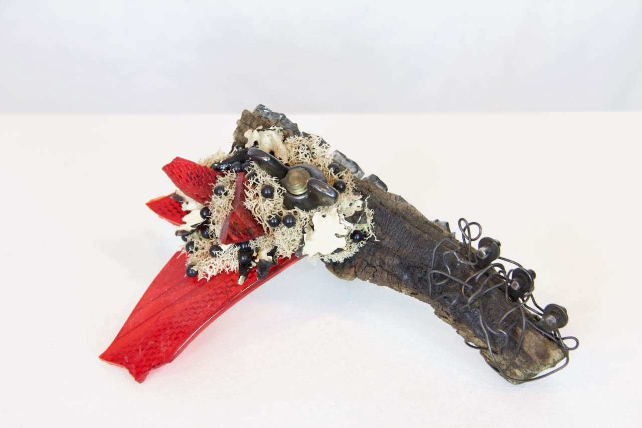 wood,broken brakelight reflectors, reindeer moss, broken car side mirror glass, map pins, wire, bicyle chain parts, wire, found wingnut and brass post.